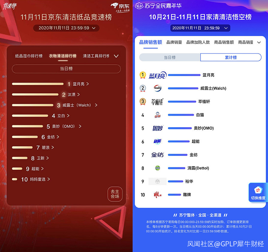 同時,在剛剛過去的2020年雙十一,藍月亮表現也十分亮眼,斬獲天貓、京東、蘇寧易購等多個平台同品類銷售額排行榜第一的成績,顯示出其強大的品牌影響力和市場競爭力。