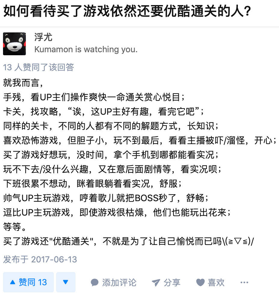雖然這樣的心態變化一度讓老王覺得多少有些難以接受,但2017年知乎上一位網友在《如何看待買了遊戲依然還要優酷通關的人?》這個問題下的回覆,還是讓他找到了一絲絲的安慰。