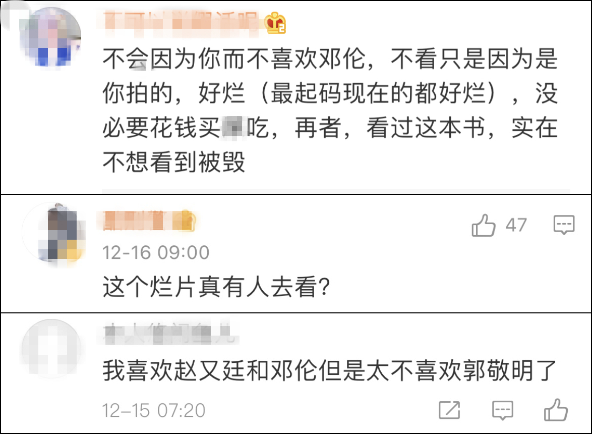 有主演鄧倫的粉絲稱因為“不喜歡郭敬明”所以不想看該片,隨後@郭敬明 急到下場回覆稱“不要因為我不喜歡鄧倫,也給我一個機會”,引發熱議。