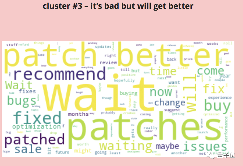 例如被分到「遊戲會更好」的評價組裏,就會看到大量的wait、patch、better,這些詞共同組成了這個評價。