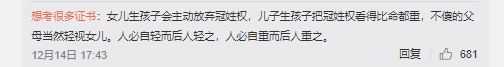 有猜説想省錢的,有猜説女兒沒有冠姓權所以被輕視的(“不傻的父母”就是會輕視女兒…)