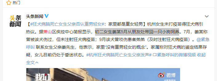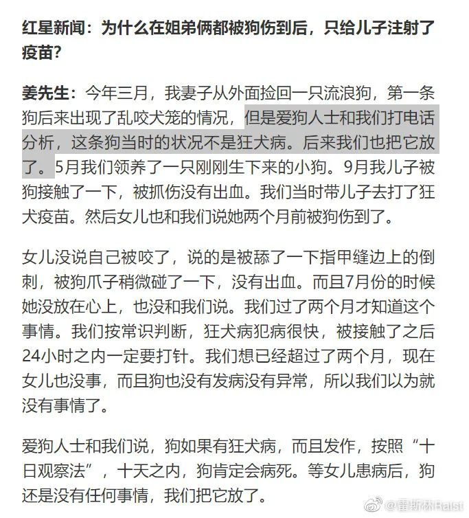 看新聞裏説的,這一家子給弟弟打疫苗不給姐姐打,最後導致姐姐狂犬病發作腦死亡。