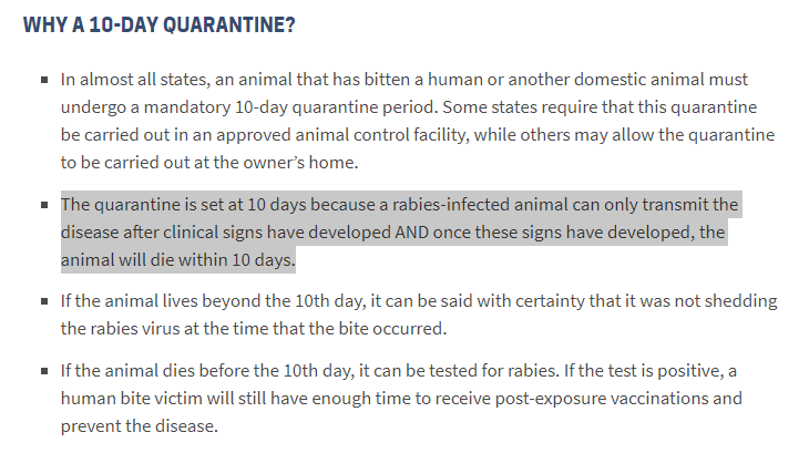 因為得了狂犬病的動物,只有在狂犬病發作之後才有傳染性,而狂犬病發作的動物,一定會在10天之內死亡。
