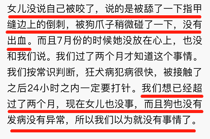 女兒這時告訴父母,她7月份也被這隻狗咬了,此時已過去兩個月,這給了父母一種錯覺——這麼長時間了不會有事,畢竟狗也沒啥事。