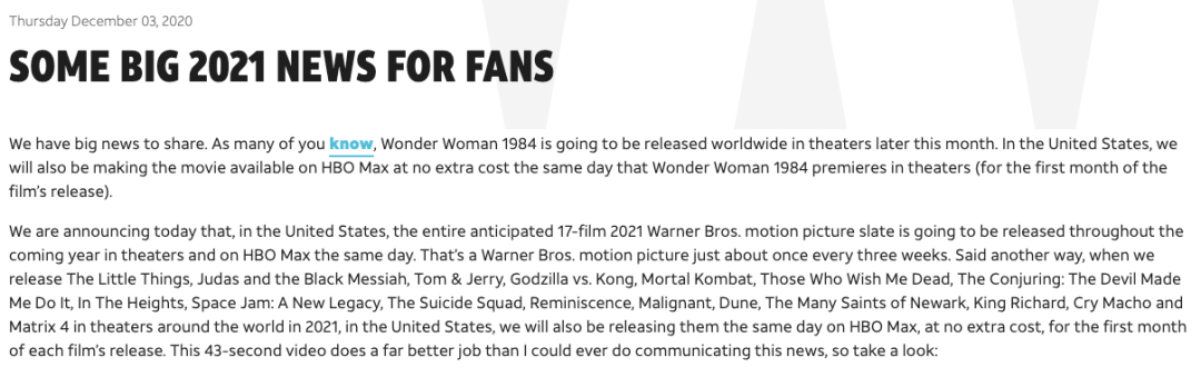 12月3日,華納傳媒CEO傑森·克萊爾(Jason Kilar)通過官網發表了一封熱情洋溢的“告粉絲書”,官宣明年華納發行的所有大片都會採取院線上映與流媒體當天同步上線的形式,包括《沙丘》《哥斯拉大戰金剛》《黑客帝國4》《貓和老鼠》《招魂3》《新自殺小隊》《哥斯拉大戰金剛》等,HBO MAX訂閲用户無需支付額外費用即可觀看。
