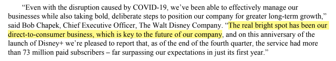 也正是因為傳統業務遭遇瓶頸,Disney+的新業務顯得更為重要。官方在11月份的四季報中就明確表示:直面消費者的業務(DTC business)是決定迪士尼公司未來的關鍵。