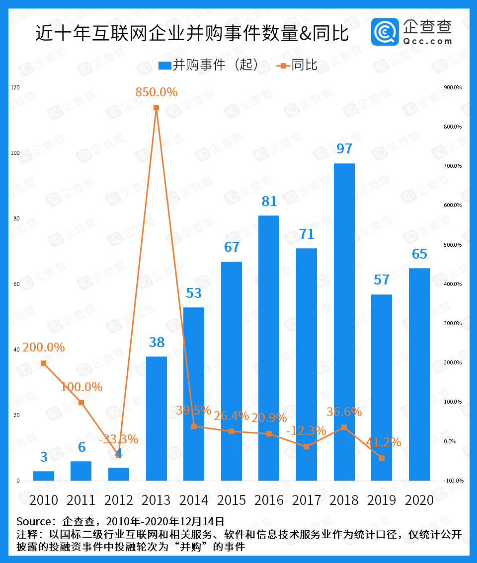 近年來我國互聯網企業開展了大量的併購交易,據企查查投融資數據顯示,2010-2020年(截至12月14日),我國互聯網企業併購事件共計542起。從年度變化來看,總體上呈現先增後降的趨勢,2018年併購事件數量到達峯值,共有97起,2019年共有57起,2020年以來共發生65起。