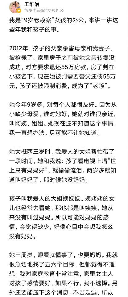 12月14日,一名認證為“9歲老賴案”女孩外公的賬號在網絡上發聲,講述了女孩揹負55萬元債務並被法院限制高消費的大致經過,並在文末稱應該能讓孩子繼承這套房產,將來生活上能有個着落。