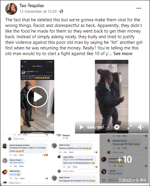 而臉書上一位名為“Tao Tequilas”的亞裔博主稱,這些年輕人租了這位老人的房子,他們不僅大聲喧譁還違反規定抽煙。老人想把錢退給他們後,趕他們出去。在退錢的過程中,老人被其中一位黑人青年掌摑。