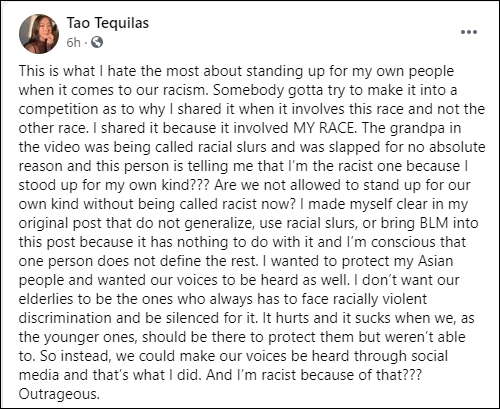 Tao Tequilas 回應表示:“現在為自己的同種族的人挺身而出就是種族主義者了嗎……我想保護我們亞洲人,也想讓我們的聲音被聽到。我不希望我們的老年人總是要面對種族暴力歧視,並因此而保持沉默。這很傷人,作為年輕的孩子,我們本應該在那裏保護他們,但沒能做到,這很糟糕。”