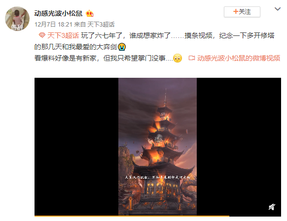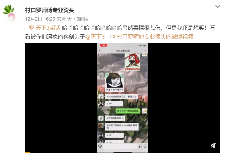 有弈劍門派玩家剪輯覆盤視頻,記錄了這一段時間的守塔經歷,以及炸塔之後的感想;還有“暴躁天津老哥”在玩家羣裏失控,哭訴官方“做個人吧”,這段像是相聲一樣的語音視頻在玩家羣裏迅速發酵,經由微博大V轉發,甚至一定程度突破了《天下3》玩家圈層,傳播到了更泛的領域。