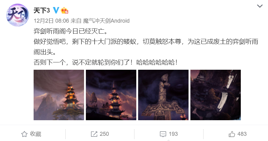 緊接着,十幾分鍾之後,魔氣沖天之劍又開一貼,告訴大家“好好看看弈劍聽雨閣最後的樣子”。