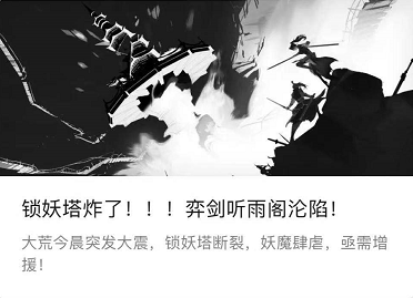 隨後的一週,《劍心問道》資料片正式上線,開啓了一場修復鎖妖塔的世界事件。而到了12月2日這一週,遊戲停服後又突然實裝了“鎖妖塔炸裂”事件。隨着一段CG,官方宣佈鎖妖塔修復失敗,魔氣湧入大荒,弈劍聽雨閣徹底淪陷。