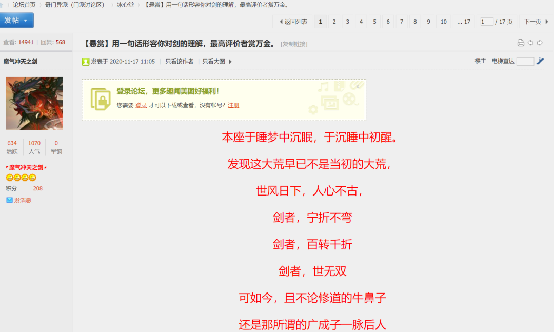 與此同時,《天下3》的官方論壇裏,官方的另一手營銷動作也開始了:論壇裏出現了名為“魔氣沖天之劍”的神秘賬號,用一種故弄玄虛的口吻發帖。起初不明真相的玩家都只是圍觀看熱鬧,把這個發帖的賬號當做一箇中二少年。