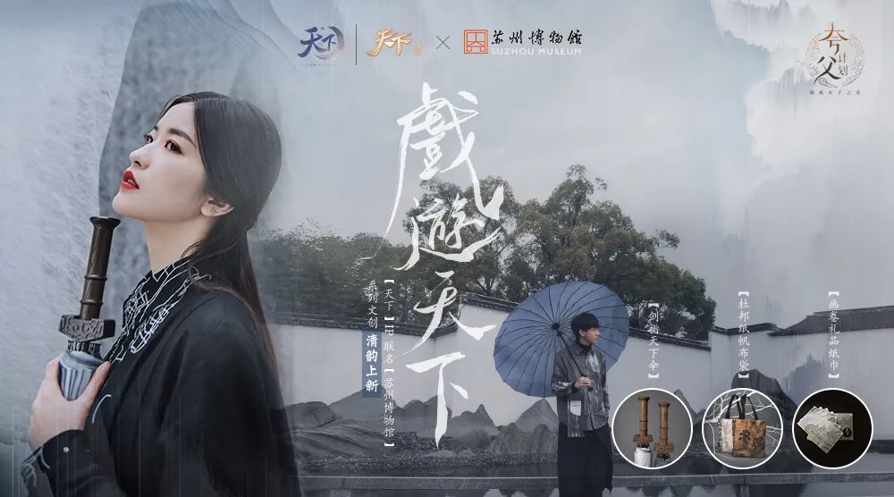除了遊戲內與傳統文化的聯動,遊戲外的衍生周邊也是《天下3》近年的重點。今年遊戲推出了與蘇博聯名的的吳王夫差劍柄樣式的花傘、和故宮博物院合作的鶴禧覺色彩妝口紅、和知名漫畫家合作的國潮T恤等。