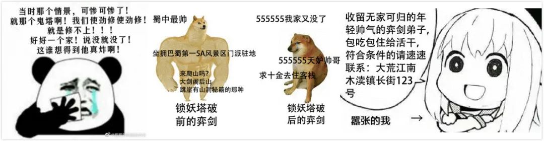 隨着這一次動態的傳播,所有玩家才意識到“真的出事了”。接下來的幾天,在微博、社羣等渠道的官方引導下,玩家開始製作、傳播表情包等UGC素材。一些弈劍門派的玩家表示一臉懵逼,不知為什麼家就沒了,對局勢的不解、修塔修得辛苦的吐槽,其他門派對弈劍的嘲諷等,一時間在玩家羣體內廣為流傳。