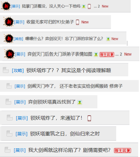 與此同時,遊戲外,官方也開始在各渠道放出弈劍門派覆滅的信息:官方論壇的弈劍聽雨閣板塊呈現出“被控制”狀態,此前的神秘賬號“魔氣沖天之劍”,成了論壇中弈劍門派版塊的版主,版塊開始禁止發佈新帖,只允許回覆。