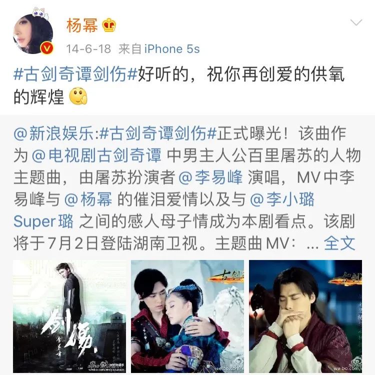 到了2014年,楊冪在微博上轉發李易峯為電視劇《古劍奇譚》演唱的主題曲,還不忘回cue自己的梗:“祝你再創‘愛的供氧’的輝煌。”