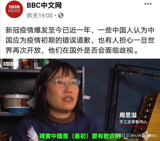 前幾天,上海一位周姓黨員的女兒,接受BBC的採訪,竟然説代表中國人就疫情對世界造成的傷害表示歉意,並且還説中國努力向全世界提供醫療物資是為了彌補自己的過失。採訪視頻放到網上後,憤怒的批評聲立馬淹沒了評論區。回想國內疫情剛爆發,有一位央視前主持人阿丘,説中國人要好好地戴上口罩,然後不豪橫地向世界説聲對不起。按捺不住想替中國人道歉的人真不少啊!