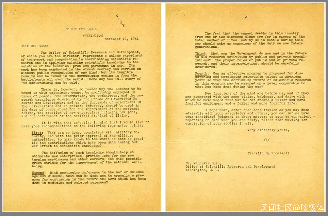 1944年11月,美國總統羅斯福給時任戰時科學研究與發展局的局長萬瓦尼爾·布什寫信,要求他對“如何把戰時的科學技術經驗應用到和平時期”這一問題給出建議。在信中,羅斯福提到“在我們面前需要一個用聰明才智開拓的新邊疆(New frontiers of the mind)”。