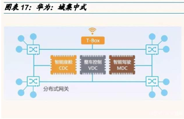 如果與華為對比,這這種區別會顯得更加明顯。在這張華為的架構示意圖中,無論是智能座艙(CDC)、整車控制(VDC)、智能駕駛(MDC)都沒有與任何中心單元相連,它們平行擔任最高領導,採用分佈式網關融合各自數據,再合併上傳雲端。