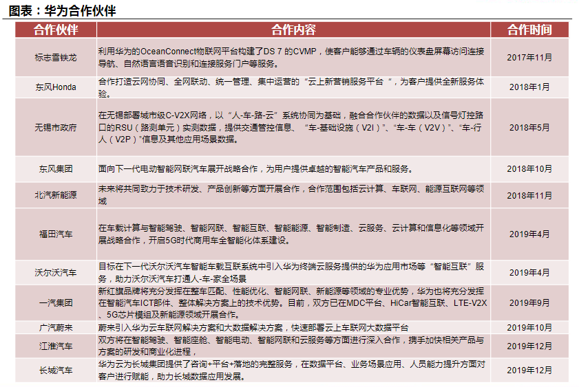 華為自2019年5月宣佈成立智能汽車BU後,到2020年9月份,與30多家車企達成合作,其中大部分為傳統車企。在回答記者的相關提問時,華為輪值董事長徐直軍就曾説到,華為和頭部造車新勢力還沒有走到交集點上,從當下的情形看,華為和傳統車企更容易出現交集點,“我們不排斥新勢力,走到一定階段也許就到交集點了”。