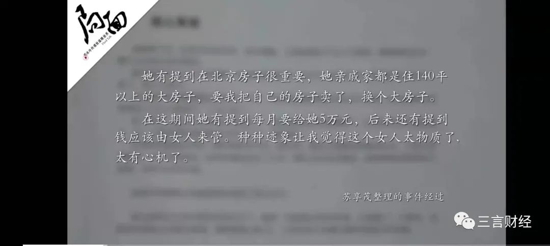 蘇享龍表示,法律上講婚前財產婚後財產,她(翟欣欣)要把我弟弟的房子賣掉,重新買一個大的房子變成婚後財產,我弟弟不能滿足她,她就離婚。