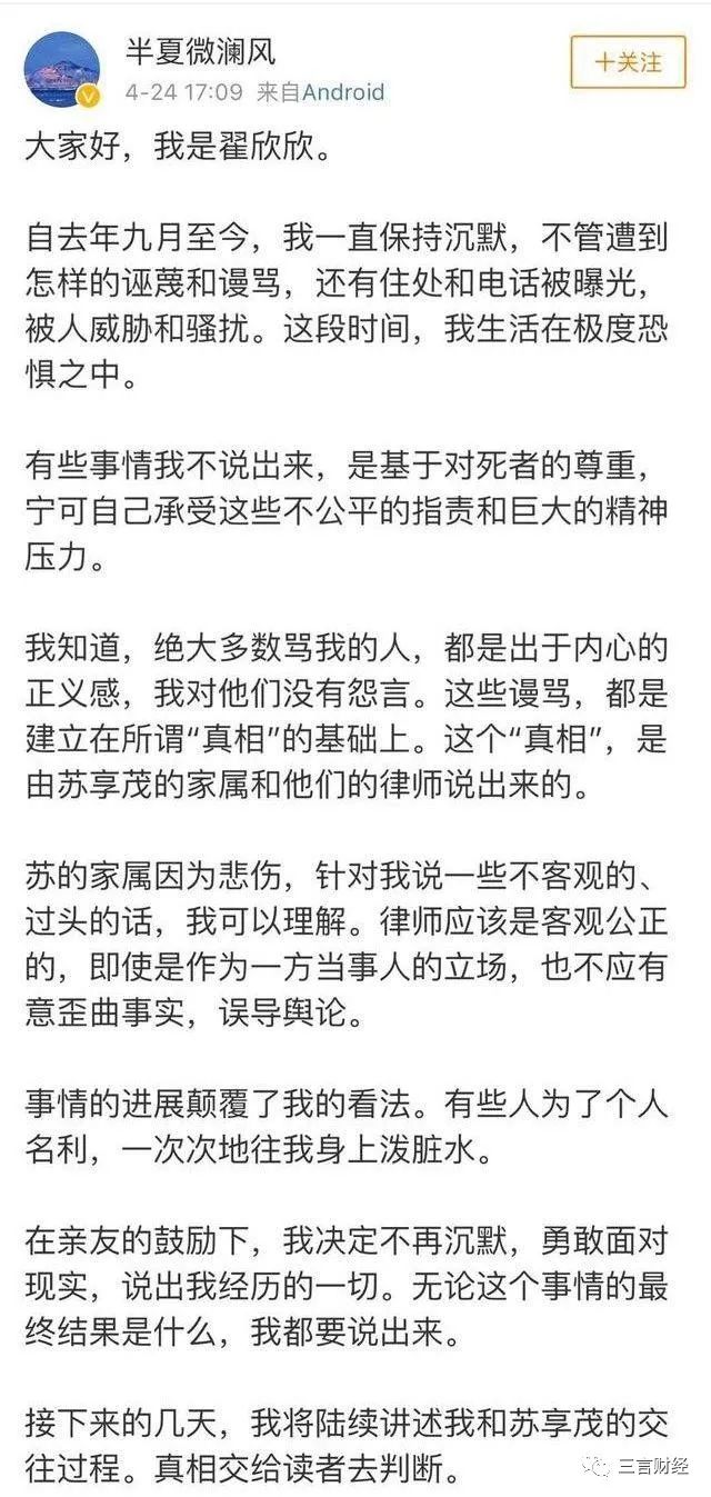 蘇享茂哥哥蘇享龍在微博中放上了弟弟蘇享茂絕筆信。在信中,蘇享茂稱“被翟欣欣給逼死了”,並敍述了與翟欣欣從結婚到選擇自殺的經過。