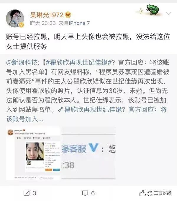 百合佳緣CEO吳琳光轉發這一消息稱:“賬號已經拉黑,明天早上頭像也會被拉黑,沒法給這位女士提供服務”。
