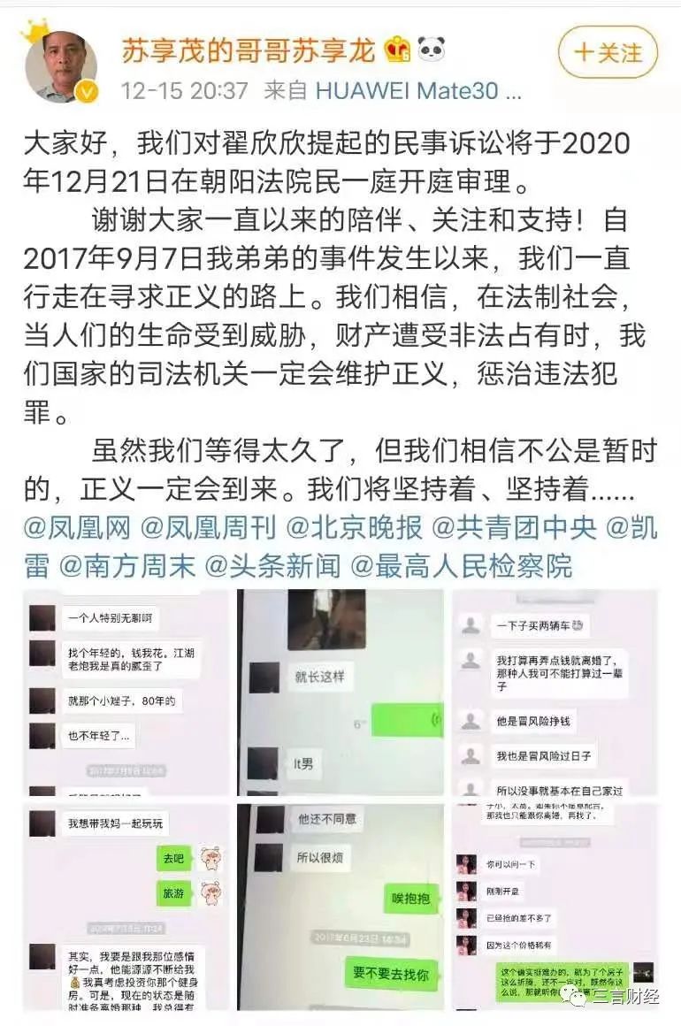 昨日,翟欣欣事件有了最新進展,12月15日,蘇享茂的哥哥蘇享龍發佈微博稱,“我們對翟欣欣****提起的民事訴訟將於2020年12月21日在朝陽法院民一庭開庭審理。”
