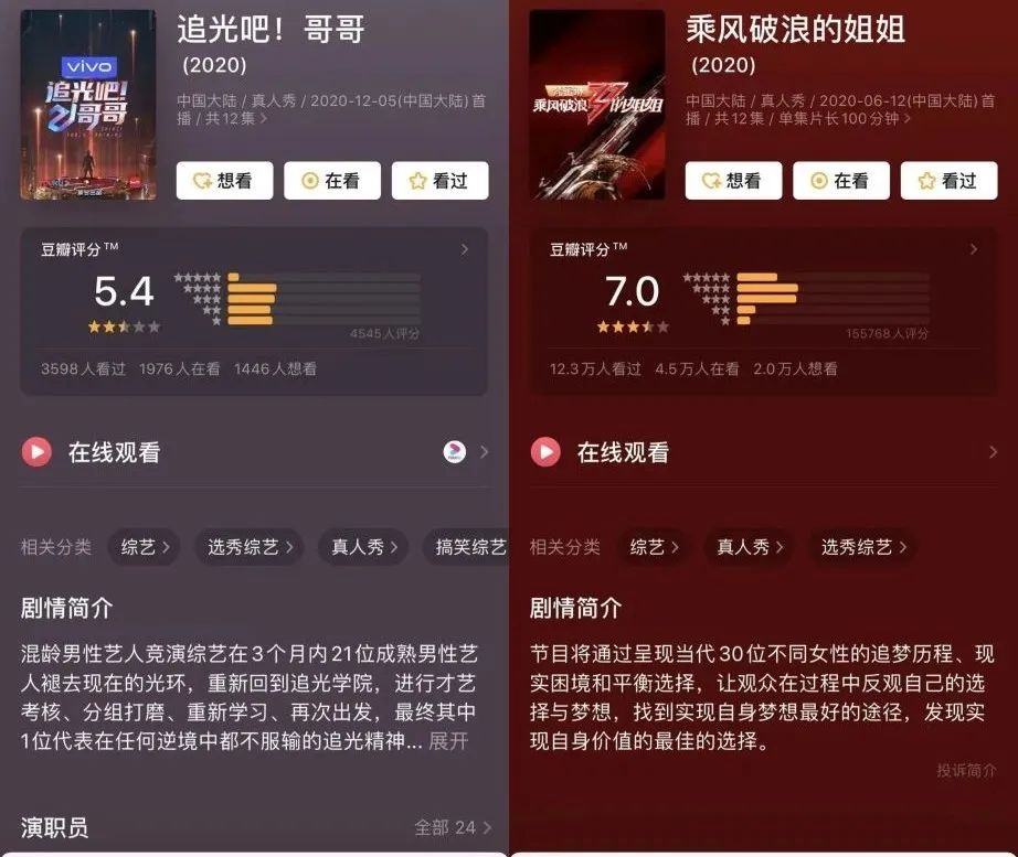 △目前《追光吧!哥哥》播了兩期在豆瓣只有3000多人標記看過,而浪姐最終是超過10w+的標記。