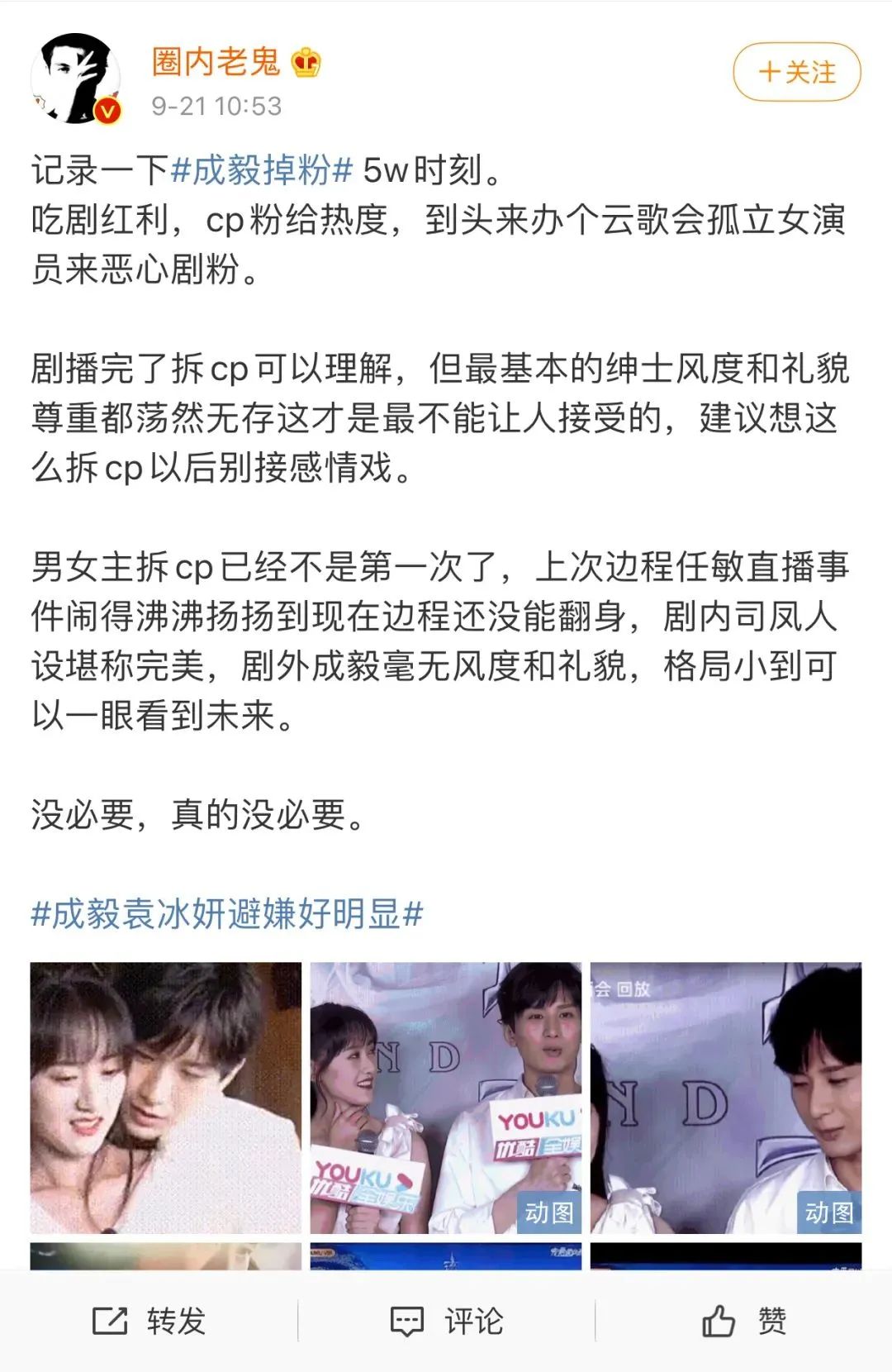 原本這種深情守護型人設是很受歡迎的,但成毅卻來一個自己拆CP的騷操作,在收官雲歌會上,不僅和女主袁冰妍全程零交流、零互動,還刻意撇清關係,和劇播時積極營業的樣子判若兩人,傷了不少CP粉的心。