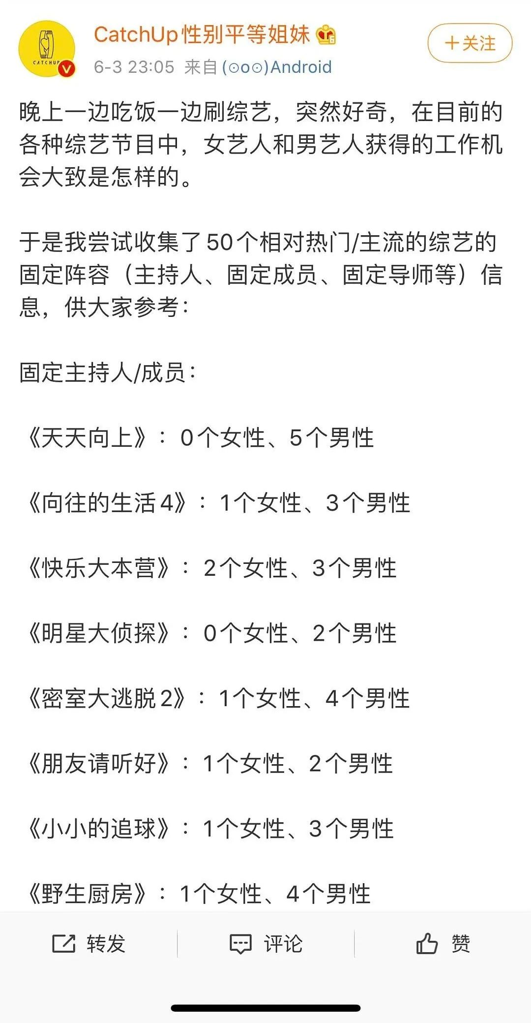 綜藝,有博主統計過,50個相對熱門/主流的綜藝固定陣容中,男性比例是遠超於女性的。