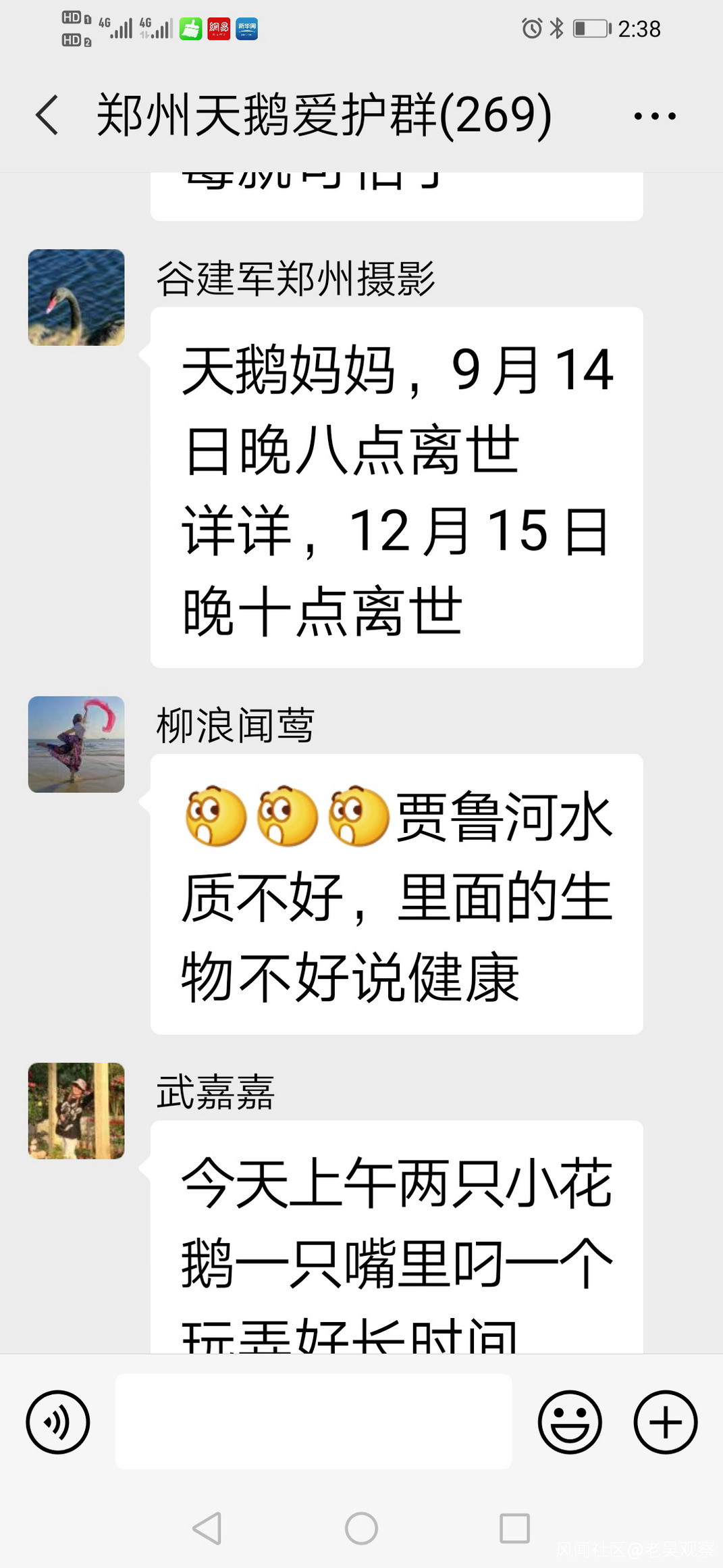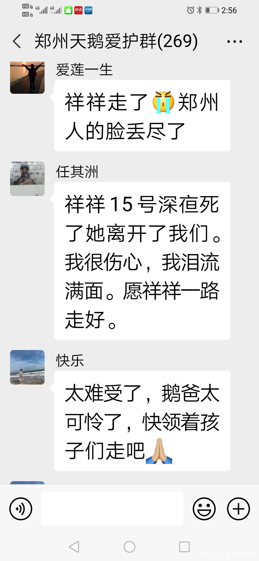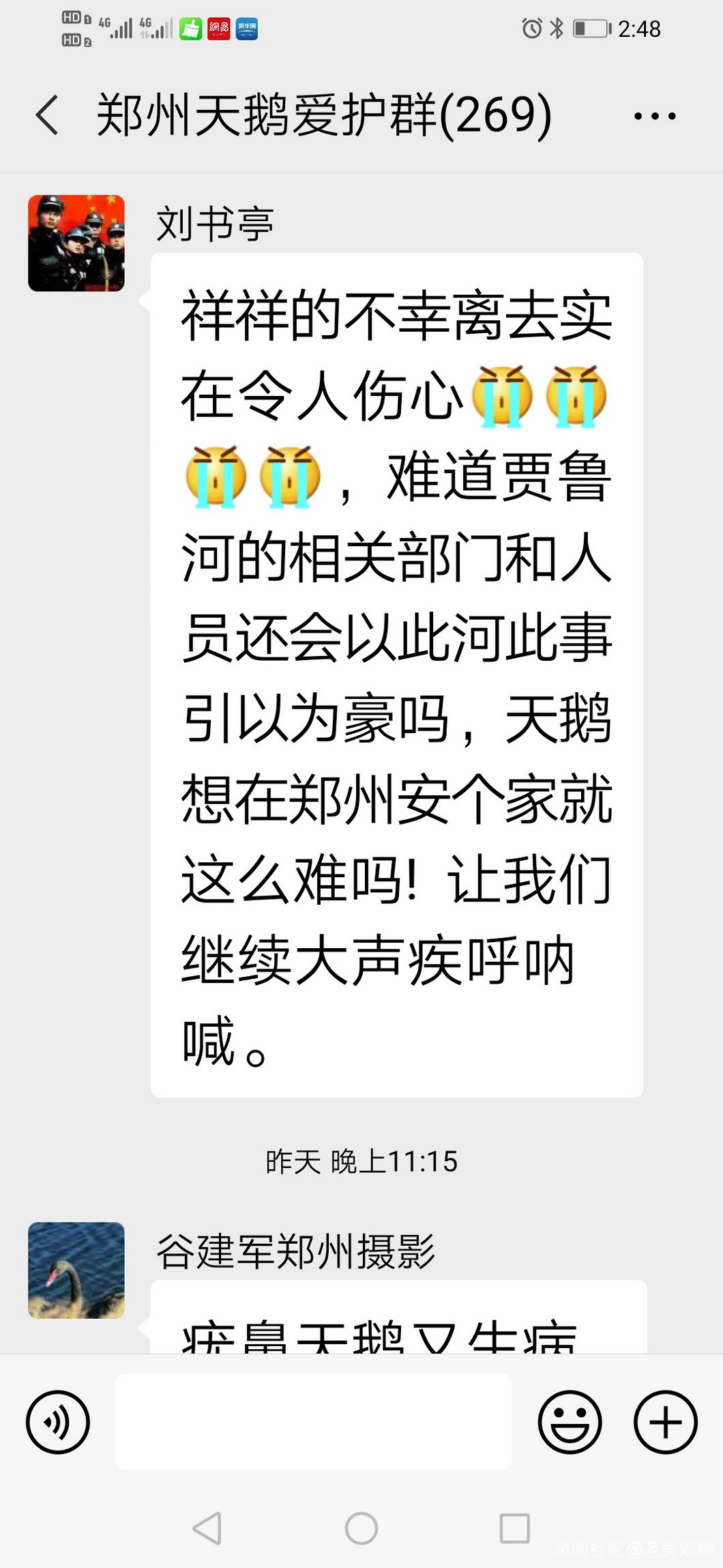 真是禍不單行,12月15日晚,天鵝祥祥救無效死亡,12月16日晚,天鵝祥祥的死亡的消息,經河南電視台都市頻道報道後,鄭州天鵝愛護微信羣裏,熱心市民紛紛發聲:
