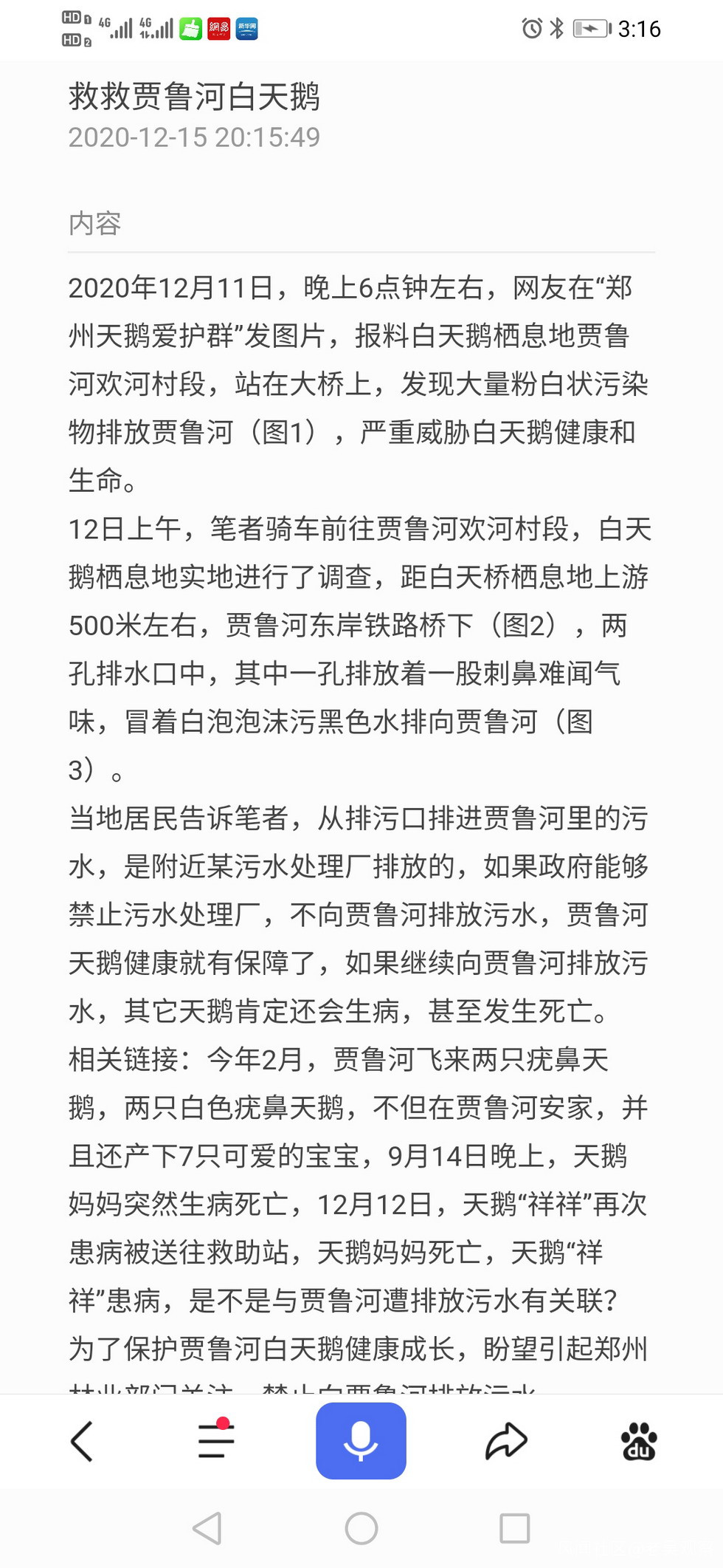 讓廣大市民欣慰的是,兩隻疣鼻天鵝,不但在賈魯河安家,還產下7只可愛的寶寶,9月15日,賈魯河傳來一個不幸的消息,天鵝媽媽14日晚,因患細菌感染,經救助站搶救無效死亡了,天鵝媽媽患細菌感染死亡,市民和天鵝保護者們,立馬聯想到是不是與賈魯河水遭附近一家污水處理廠,往河裏排污污染有關?熱心市民紛紛通過電話、網站、微信等,求助市長、環保、水利部門熱線。