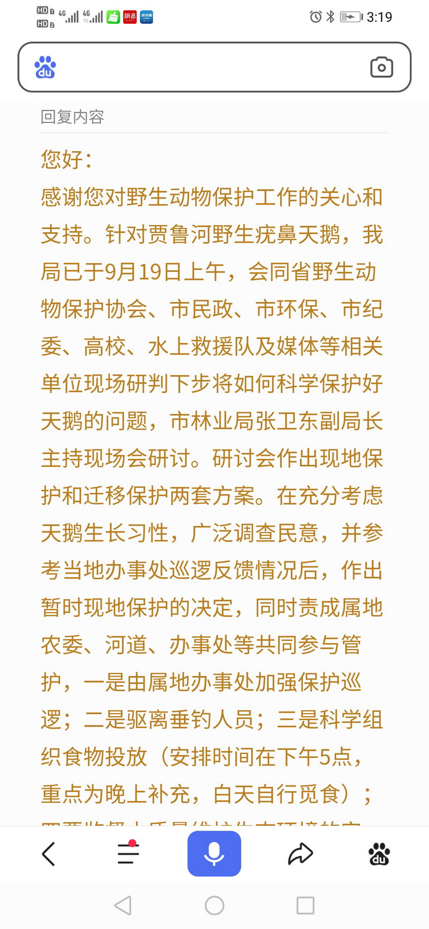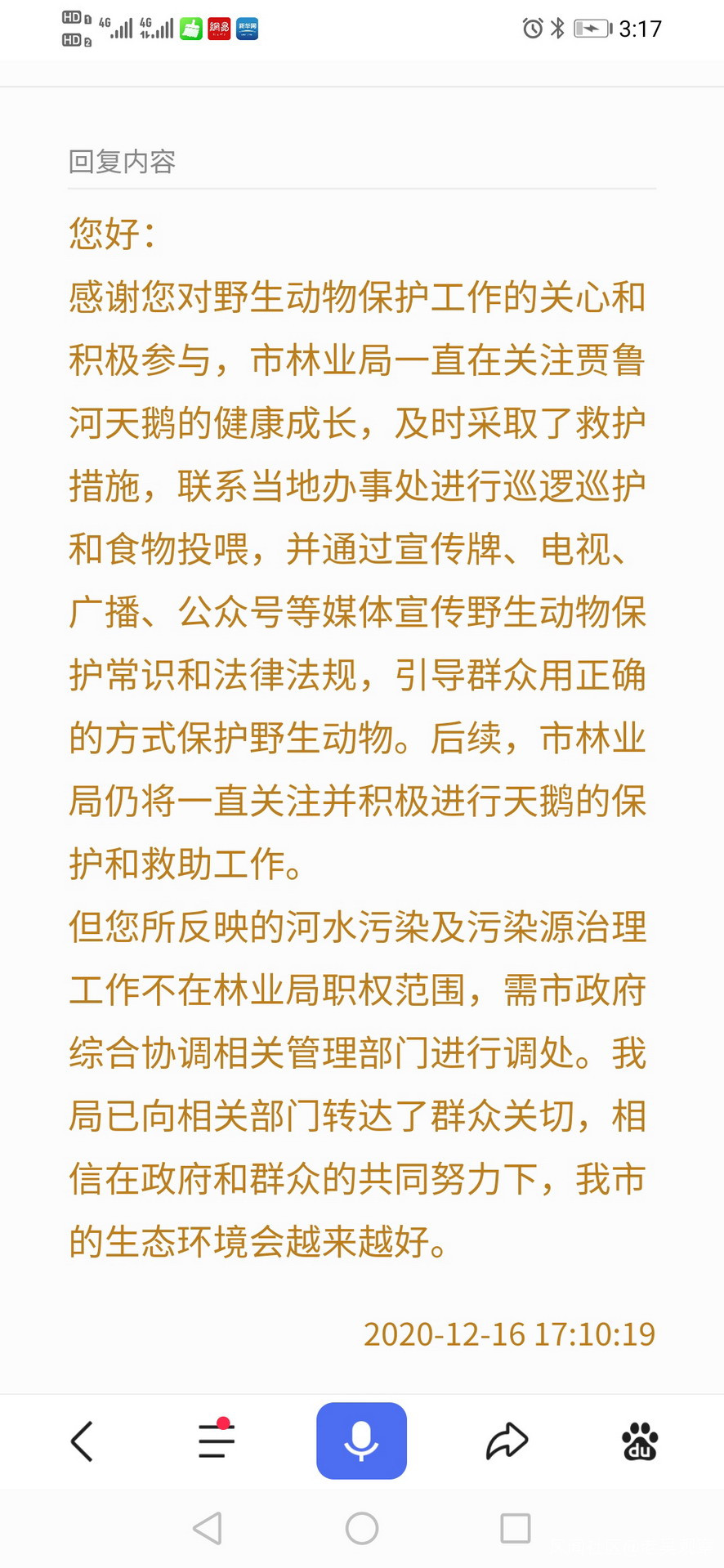 讓市民們不敢相信的是,政府有關部門和專家到賈魯河天鵝生活區域實地觀察後,告訴市民,某污水處理廠排放的水,對天鵝影響不大,疣鼻天本來就喜歡生活在沼澤、湖泊等,目前賈魯河裏的水雖然髒點,但不至於造成天鵝死亡,不要説動物,人也有生老病死,正常死亡,誰也管不了,如果非要牽強天鵝死與水質有關,誰也沒有辦法。