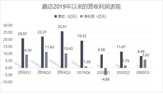從2019年Q4起,趣店業績持續下滑,看起來今年第三季度也沒能例外,整體業績表現並不樂觀。財報顯示,第三季度趣店總收入8.49億元,同比下降67.2%,淨利潤5.92億元,同比下降43.2%。