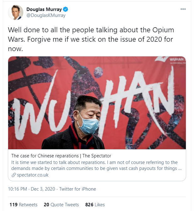 12月5日,英國著名保守派公知 道格拉斯·穆雷 (Douglas Murray)在網上發佈了一篇文章重申他的觀點:要求中國為新冠病毒的擴散做出賠償。
