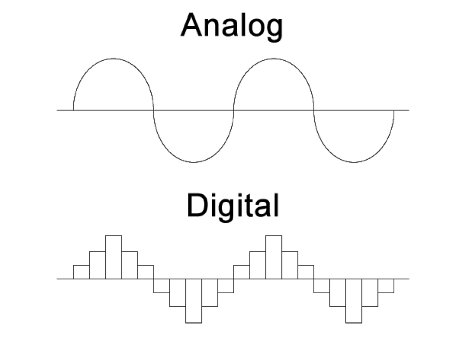 除了生、死、日出、日落等離散事件,自然界的現象確實以模擬為主。氣温是連續變化的,不會跳變;色彩是連續漸變的,沒有分明的界限;等等。數字信號只能是離散的逼近,而且永遠有截斷誤差,如圖所示。另一方面,由於模擬量的無窮連續性,所以也可以無限放大,具有無限分辨力。