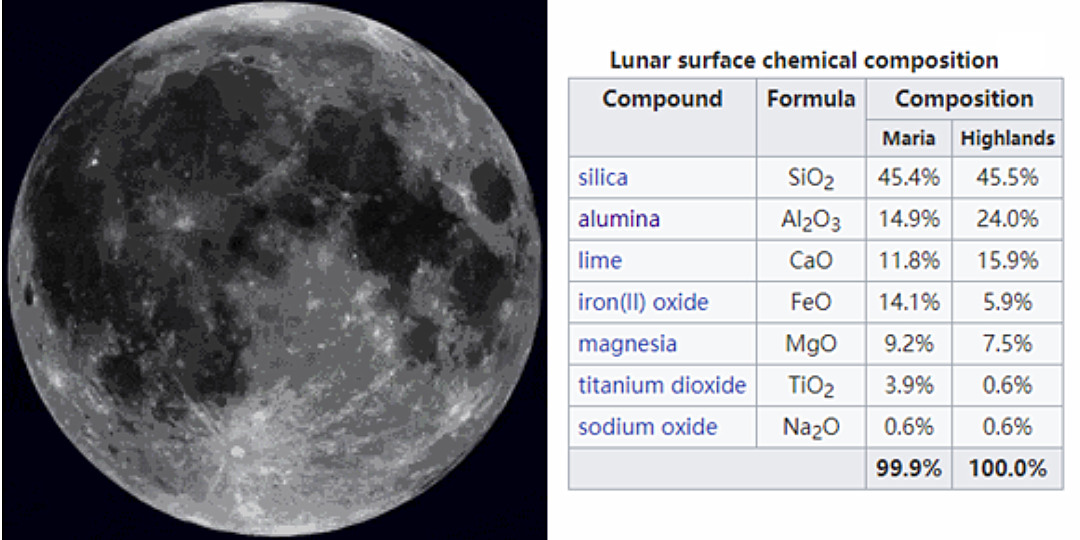 月球表面主要的元素有氧、硅、鐵、鎂、鈣、鋁、錳和鈦,另外還有極少量的稀土元素。但你別高興得太早,由於月球上沒有水,這些元素絕大多數以氧化物的形態存在,比如二氧化硅、氧化鋁、氧化鈣、氧化鐵等等,這些氧化物幾乎佔了月球表面物質的全部,只有極少極少以金屬單質的形態存在於岩石裏。