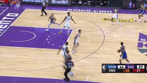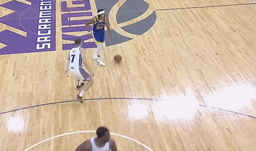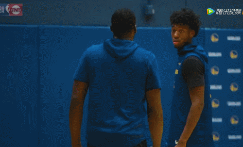 第二場有一個場景,他和魏森做45度角擋拆,做完一個背後換手,不知道是沒有控制好球而脱手,還是有意為之,居然直接拍給了魏森。這個21歲的小夥子下意識地去撈這個球,庫裏順勢接過上籃。