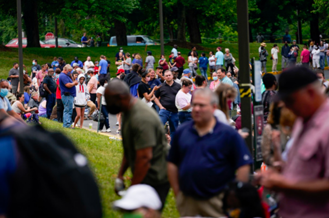 2020年6月18日,人們在美國肯塔基州法蘭克福排隊等待就業中心開門。