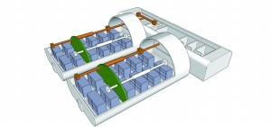 “月宮一號”分兩期建設,目前建成的是一期,由1個綜合艙和1個植物艙組成,可以為3位志願者提供生命保障。其中,綜合艙包括居住間、人員交流和工作間、洗漱間、廢物處理和昆蟲間。植物艙分隔為2個植物間,可根據不同植物生長需要獨立控制環境條件。