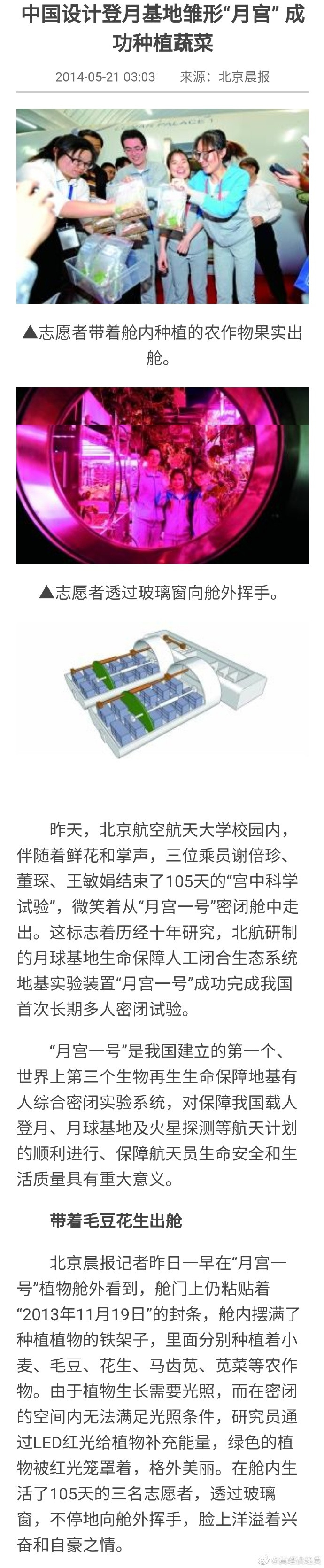 昨天,北京航空航天大學校園內,伴隨着鮮花和掌聲,三位乘員謝倍珍、董琛、王敏娟結束了105天的“宮中科學試驗”,微笑着從“月宮一號”密閉艙中走出。這標誌着歷經十年研究,北航研製的月球基地生命保障人工閉合生態系統地基實驗裝置“月宮一號”成功完成我國首次長期多人密閉試驗。