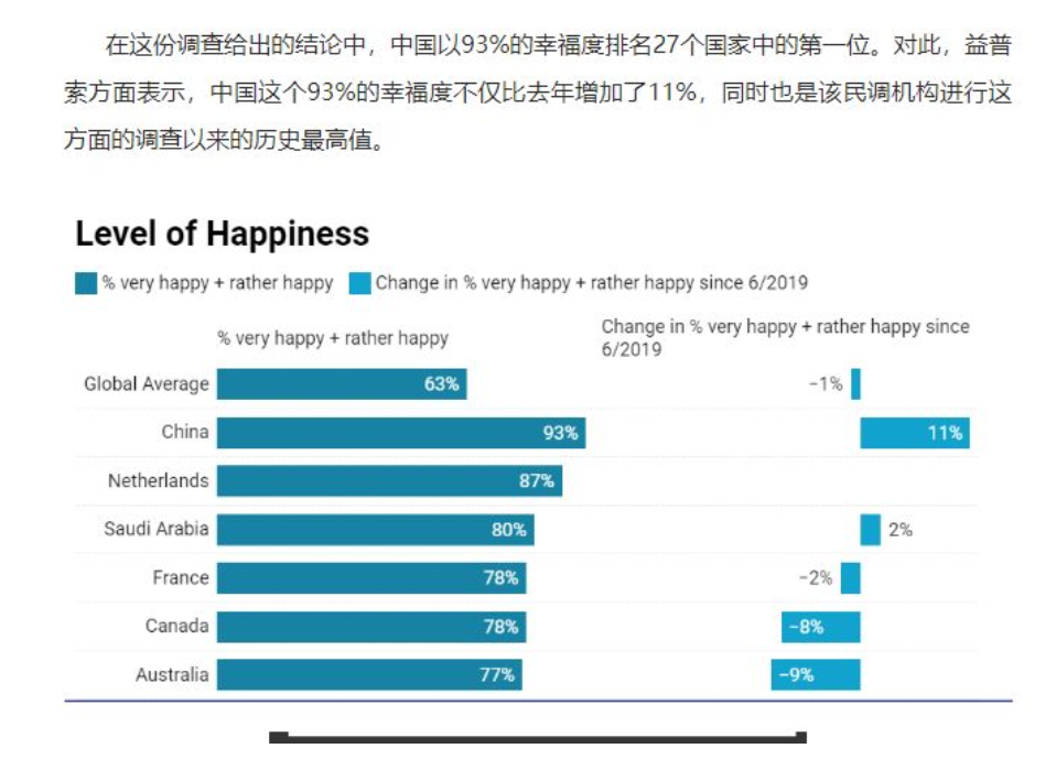 益普索出了一份調查報告,2020中國的“幸福度”,排名世界第一。