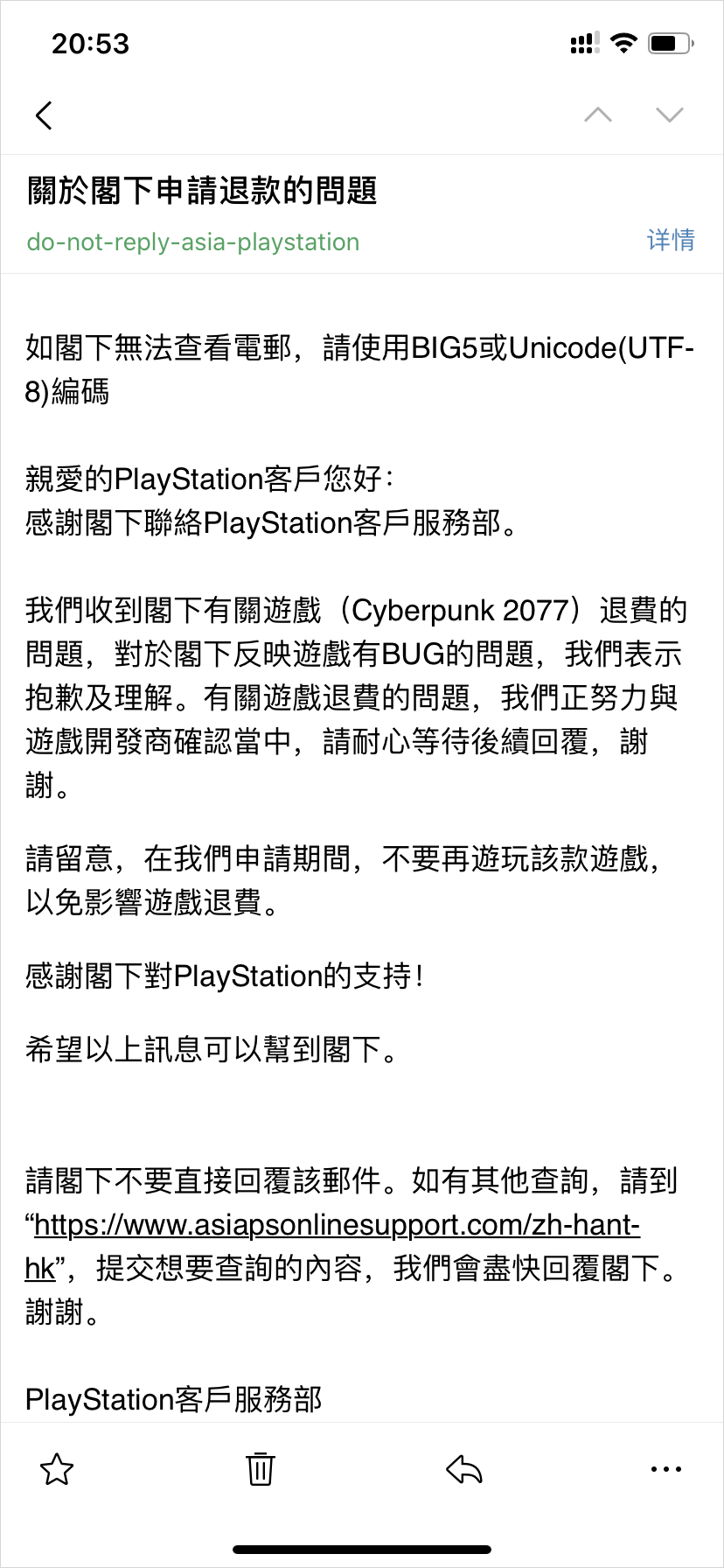 索尼平台玩家收到的回覆郵件,絕不是“你的退款沒問題了”的意思
