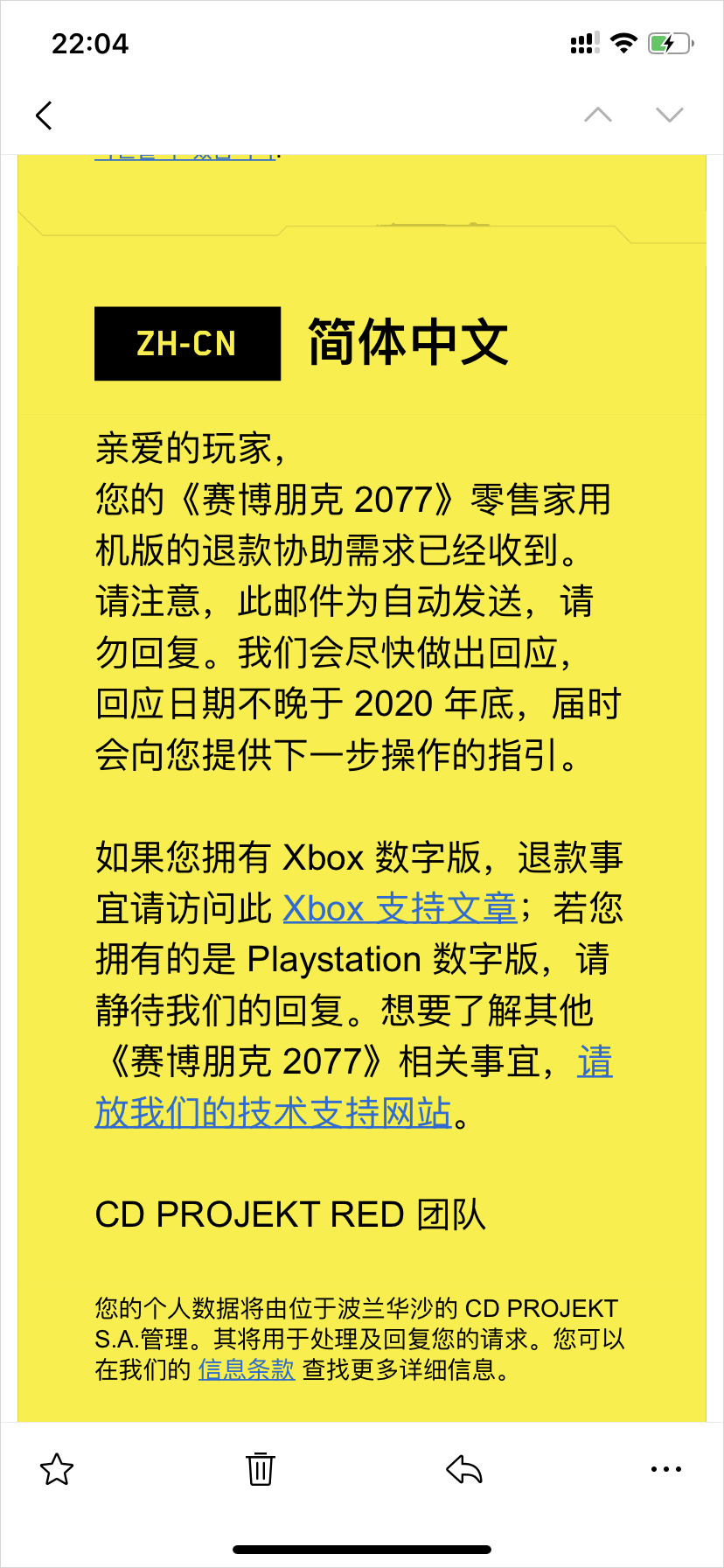 CDPR團隊給申請退款玩家的回覆,簡單來講只是“你想退款,我們已經知道了”