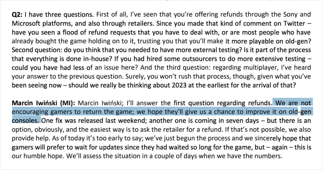 電話會議上,CDPR聯合創始人Marcin Iwinski提到:“我們並不鼓勵玩家退回遊戲,我們希望他們給我們一個改進舊世代主機版本的機會。”他進一步解釋説:“最簡單的辦法當然是要求退款。如果退不了,我們也會提供幫助。但如今仍然言之尚早,目前這些程序剛剛開始,我們仍然希望玩家寧願等等更新,因為他們已經等了很長時間了。這是我們卑微的希望。”