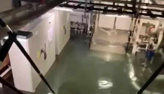 從這段拍自水兵宿舍區的畫面,可以看出,大量的海水正從天花板流入艙中, 最嚴重的時機艙內的水深接近1米。