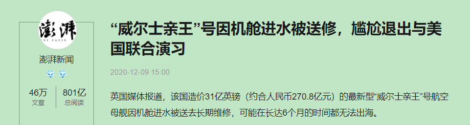 今年五月的時候,就有官媒報道,停靠在英國朴茨茅斯海軍基地剛剛服役5個月的英國"威爾士親王"號航母突然發生嚴重漏水事故。